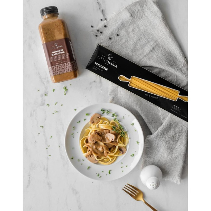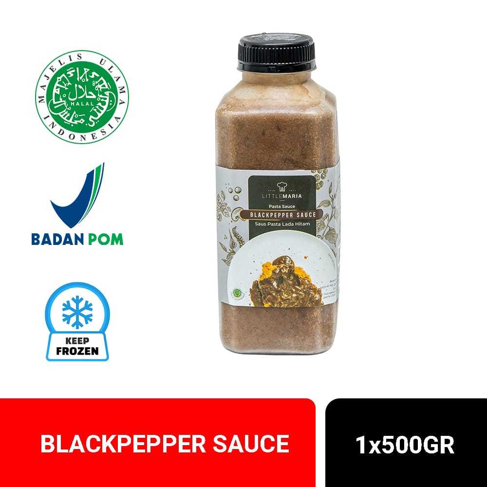 Saus rasa black pepper atau lada hitam merk Little Maria ukuran 500 gram per botol